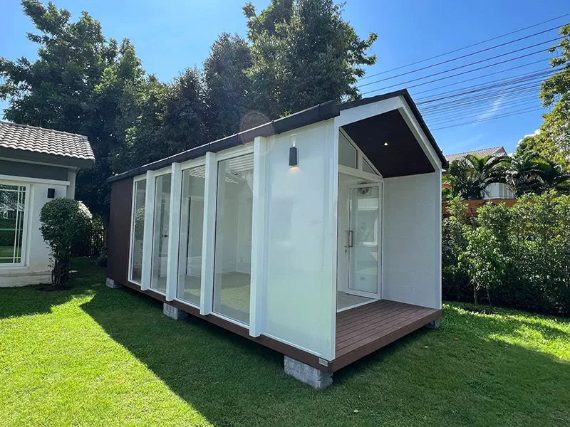หัวใจของบ้านสำเร็จรูปคือผนัง โรงงานควรใช้ระบบผนังฉนวนกันความร้อน เช่น Sandwich Panel (โฟมฉนวนฯ EPS หรือ PU) ที่มีความหนาเหมาะสม เพื่อช่วยลดอุณหภูมิภายในบ้านและป้องกันเสียงรบกวนจากภายนอกได้อย่างมีประสิทธิภาพ